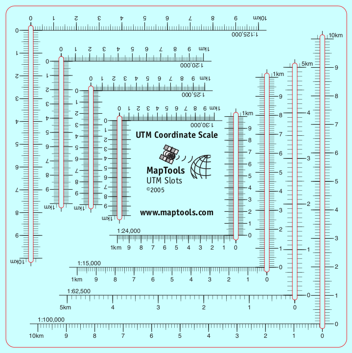 This tool combines 14 of the most common topographic map scales into a single tool about the size of a CD. The slot style tool gives easy access to the map for marking, while maintaining superior accuracy.