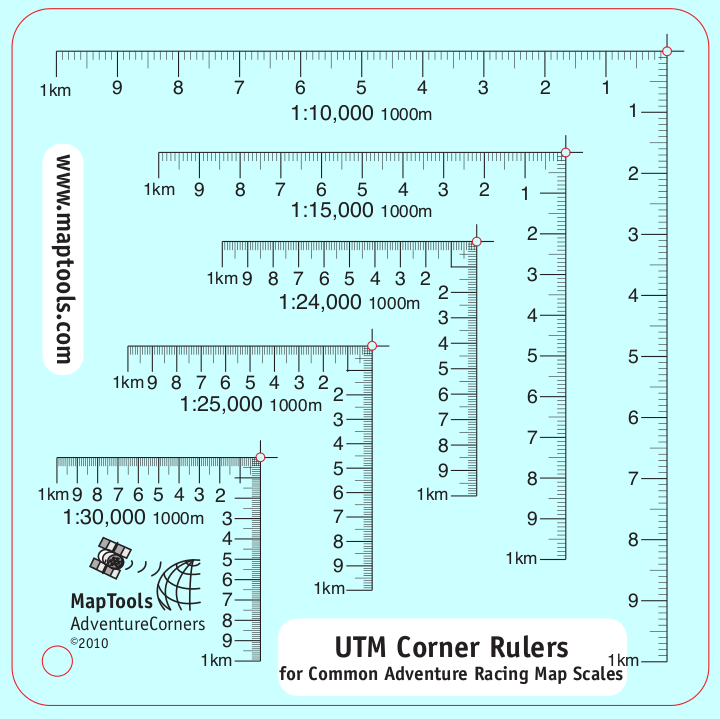 Five corner rulers on a single card covering the most common map scales used in adventure races. Each corner ruler allows you to plot a UTM coordinate within a 1km map grid with 10m precision. Each corner has a small hole to allow for placing a mark on the map.