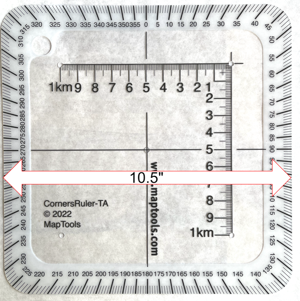 We use the same scale for our UTM Grid style classroom training aid, so it’s easy to move students from the conceptually simple idea of the grid tool that just fits inside the grid, to the more complicated, but more precise, measurements they can make with a corner ruler style tool.