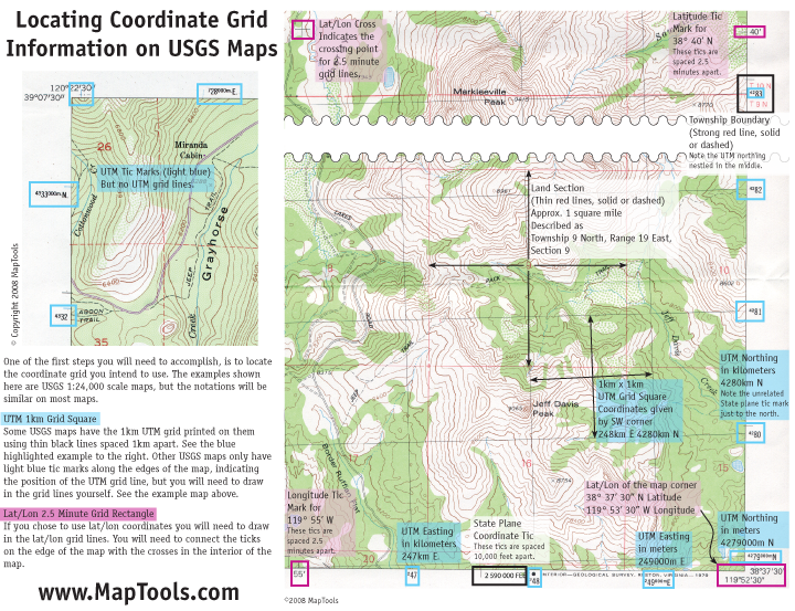 This is a handout I use in my navigation classes. This is a full color page with a sample map showing where to find coordinate grid information for UTM and Latitude/Longitude on USGS topographic maps. Public land survey sections and State Plane coordinates are also shown. You can download the pdf for free. We'll send you a copy with your order for free. Or, if you need a bunch for your class, we sell them for less than you could print them on your own printer.