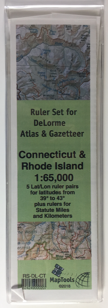 This ruler set was designed to be used with the DeLorme® Atlas & Gazetteer for Connecticut & Rhode Island. It contains 5 ruler pairs for measuring latitude longitude coordinates at latitudes ranging from 39° to 43° on a map with a scale of 1:65,000. It also contains rulers for measuring statute miles and kilometers.