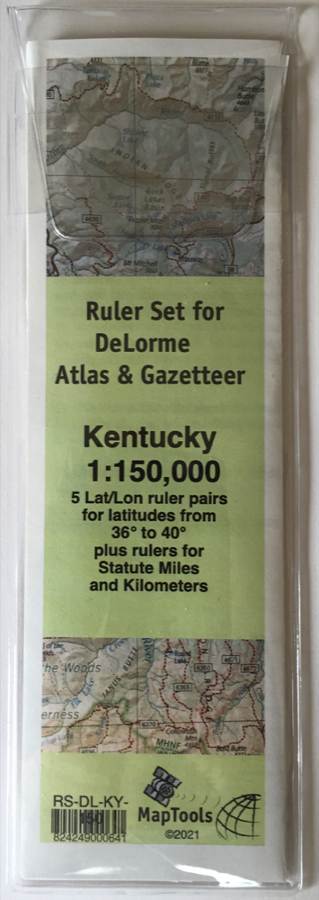 This ruler set was designed to be used with the DeLorme® Atlas & Gazetteer for Kentucky (older 1:150,000 sacal maps). It contains 5 ruler pairs for measuring latitude longitude coordinates at latitudes ranging from 36° to 40° on a map with a scale of 1:150,000. It also contains rulers for measuring statute miles and kilometers.