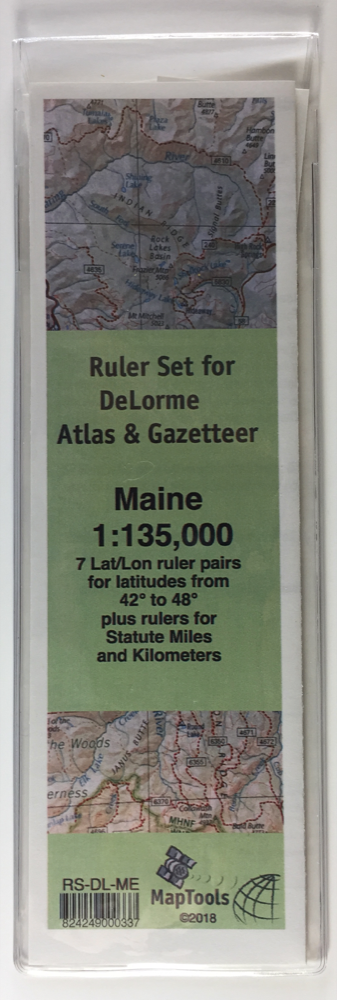 This ruler set was designed to be used with the DeLorme® Atlas & Gazetteer for Maine. It contains 7 ruler pairs for measuring latitude longitude coordinates at latitudes ranging from 42° to 48° on a map with a scale of 1:135,000. It also contains rulers for measuring statute miles and kilometers.
