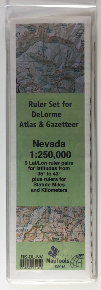 This ruler set was designed to be used with the DeLorme® Atlas & Gazetteer for Nevada. It contains 9 ruler pairs for measuring latitude longitude coordinates at latitudes ranging from 35° to 43° on a map with a scale of 1:250,000. It also contains rulers for measuring statute miles and kilometers.