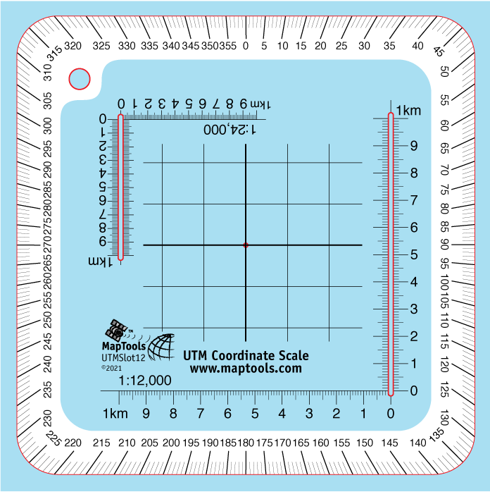 This tool enables you to plot UTM coordinates to a 10 meter accuracy within a 1 kilometer grid square. The tool also has a compass rose along its outside edge. This makes plotting or measuring a bearing a snap. The small size of this tool will allow you to keep it handy in your pocket. A band of white ink around the edge of the tool makes reading the compass rose easier and also keeps the tool from "disappearing" when you place it on the map. There is also a lanyard hole in the upper left corner.