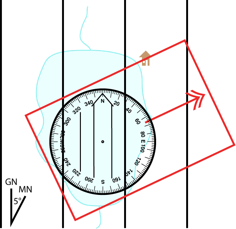 On a compass where the compass capsule is moved relative to the angular measurement ring, an adjustment for 5° East will look like this: