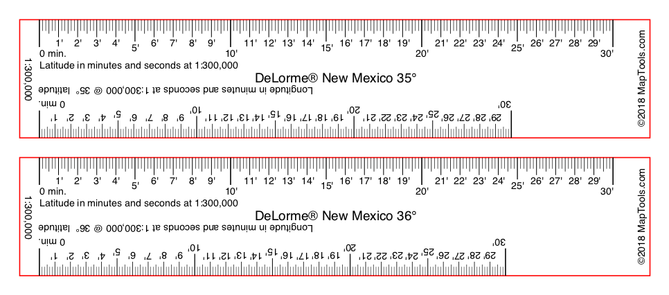 This ruler set was designed to be used with the DeLorme® Atlas & Gazetteer for New Mexico. It contains 9 ruler pairs for measuring latitude longitude coordinates at latitudes ranging from 30° to 38° on a map with a scale of 1:300,000. It also contains rulers for measuring statute miles and kilometers.